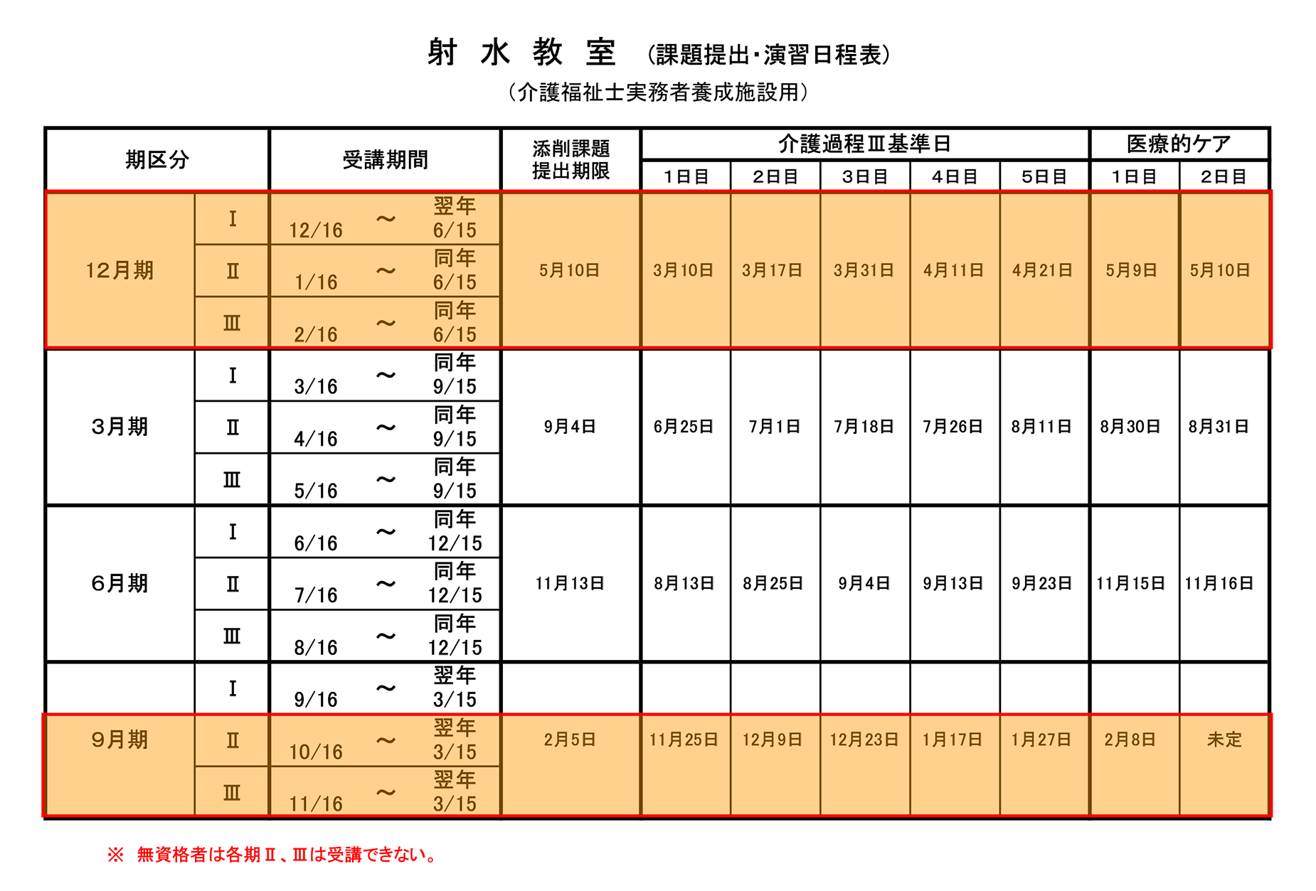 【無資格者】通信19課題・スクーリング2科目6~7回 【ホームヘルパー2級 修了者】通信11課題・スクーリング2科目6~7回 【介護職員初任者研修 修了者】通信10課題・スクーリング2科目6~7回 |